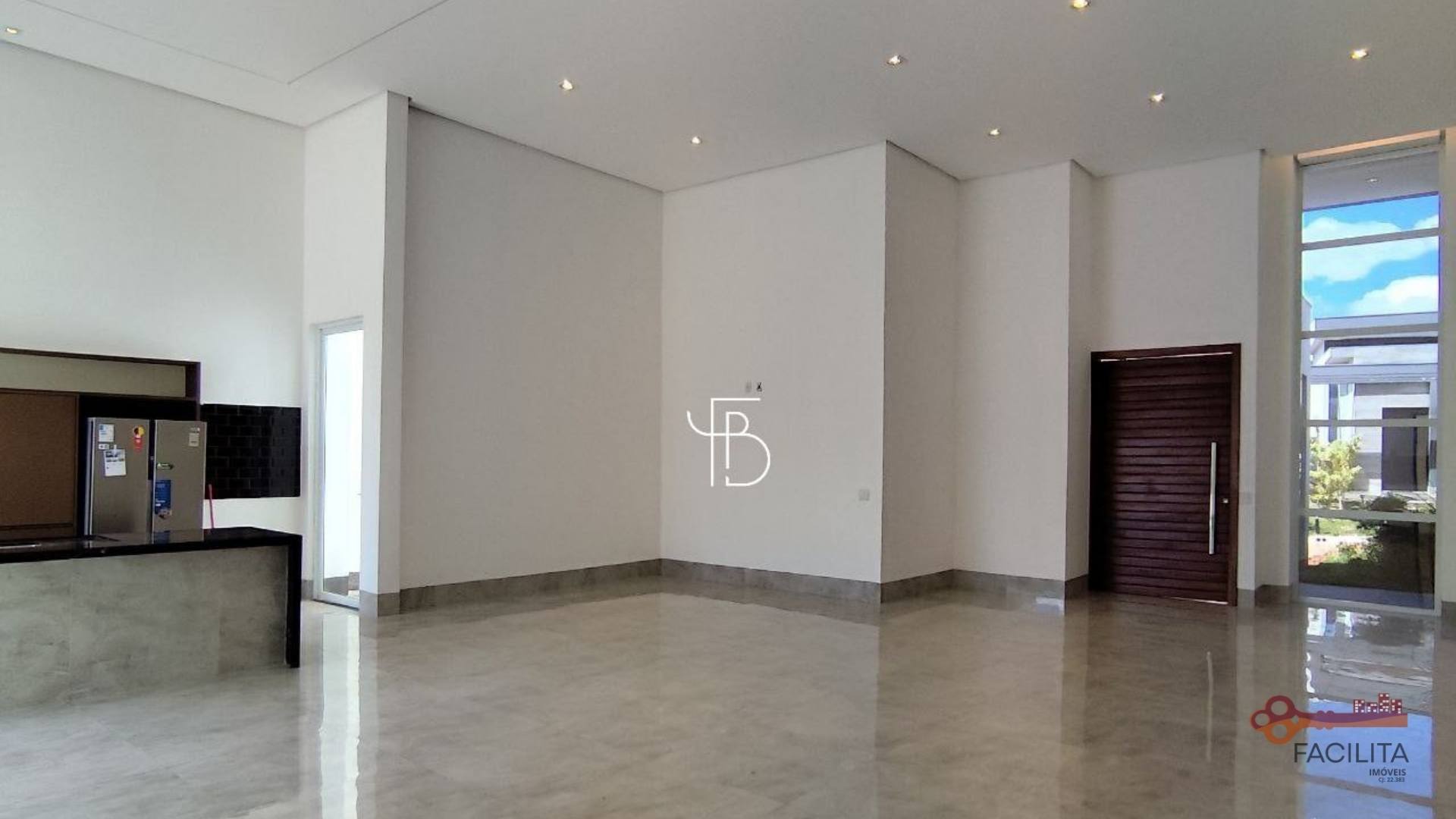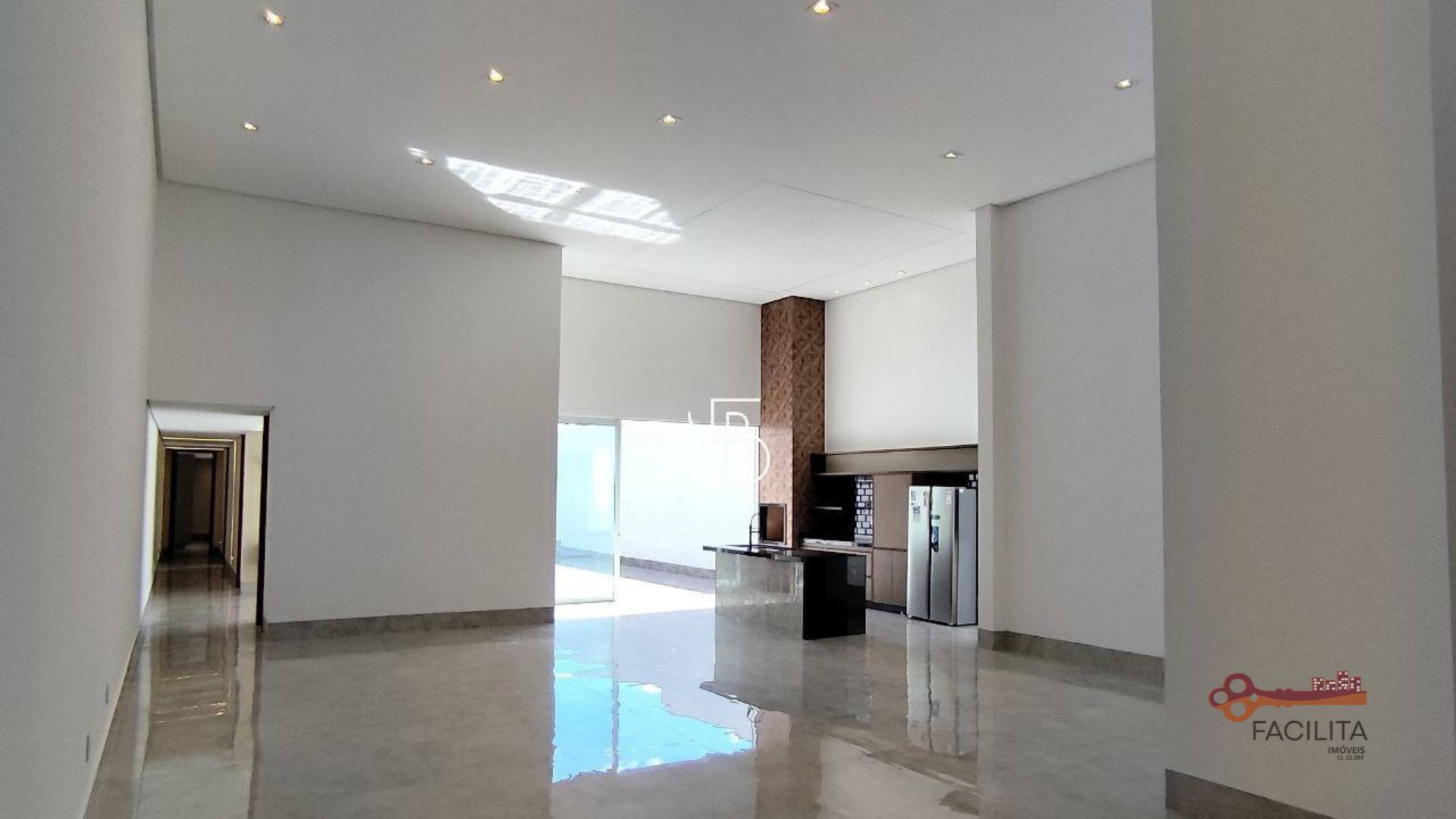 - Sala de estar com pé direito duplo, integrada à sala de jantar (conceito minimalista)