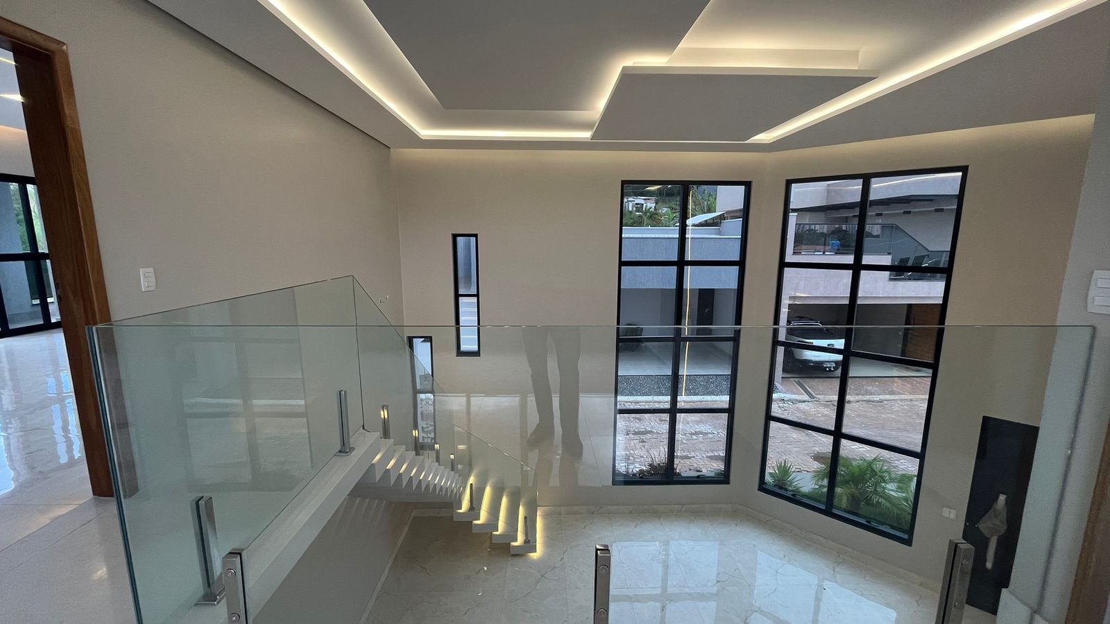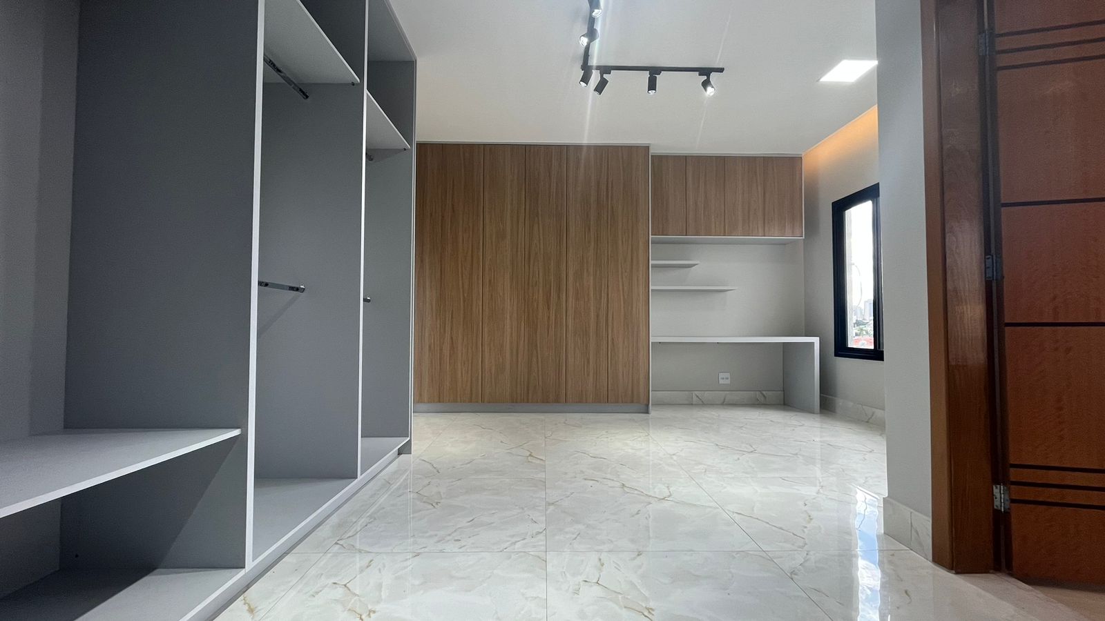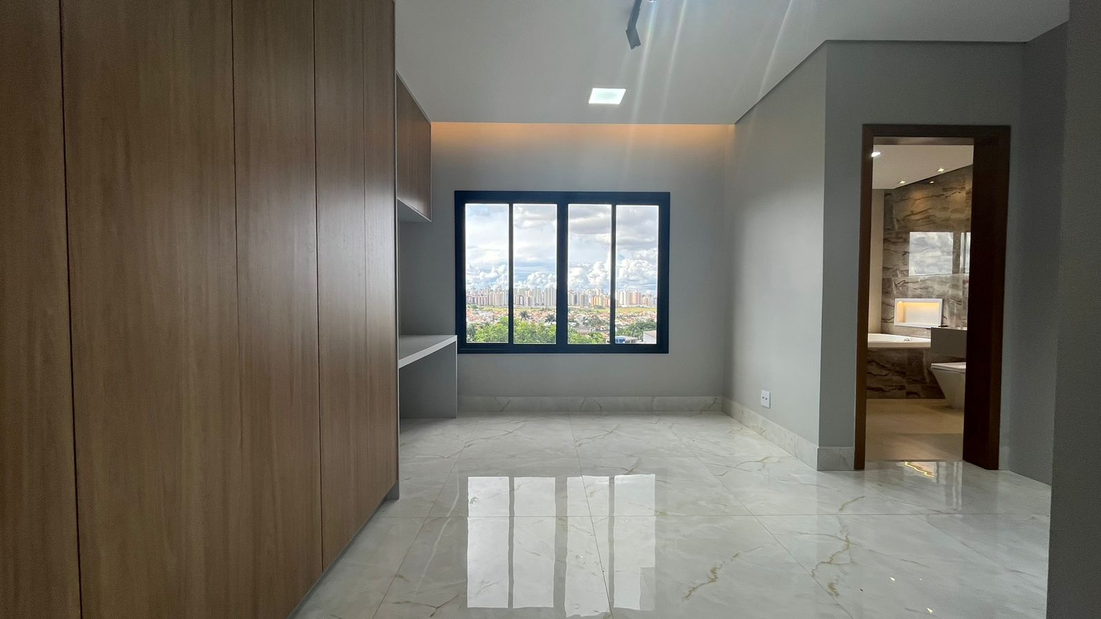 Subindo para o segundo pavimento, a suíte master aguarda para ser seu refúgio particular. Com varanda privativa, closet espaçoso e uma luxuosa banheira de hidromassagem, Um escritório completo complementa esta área, oferecendo um espaço dedicado para suas atividades profissionais.