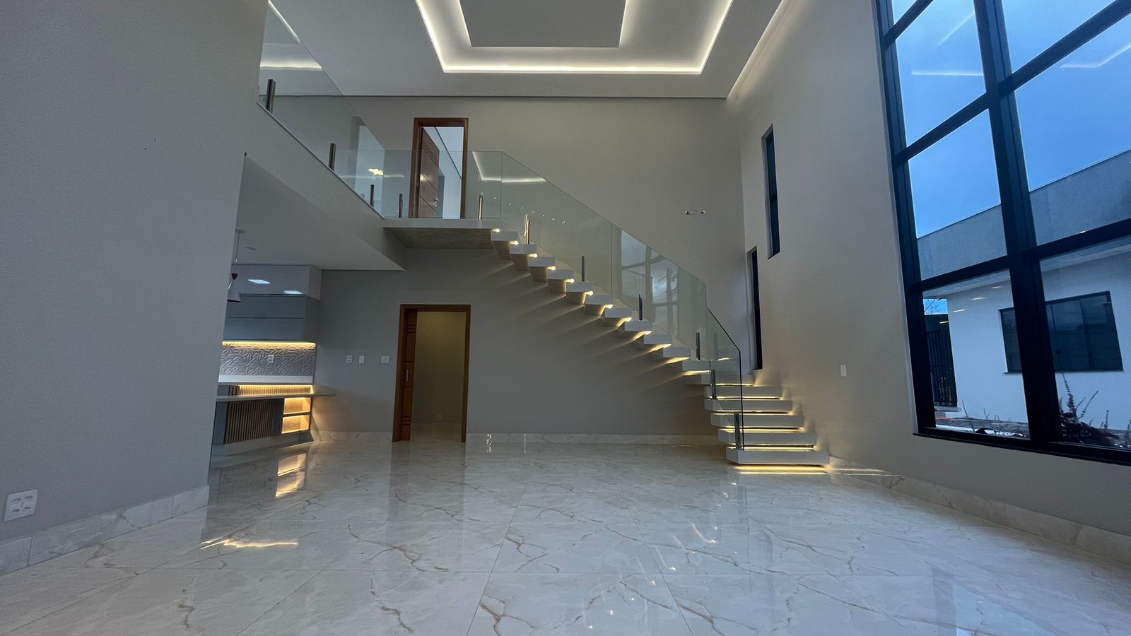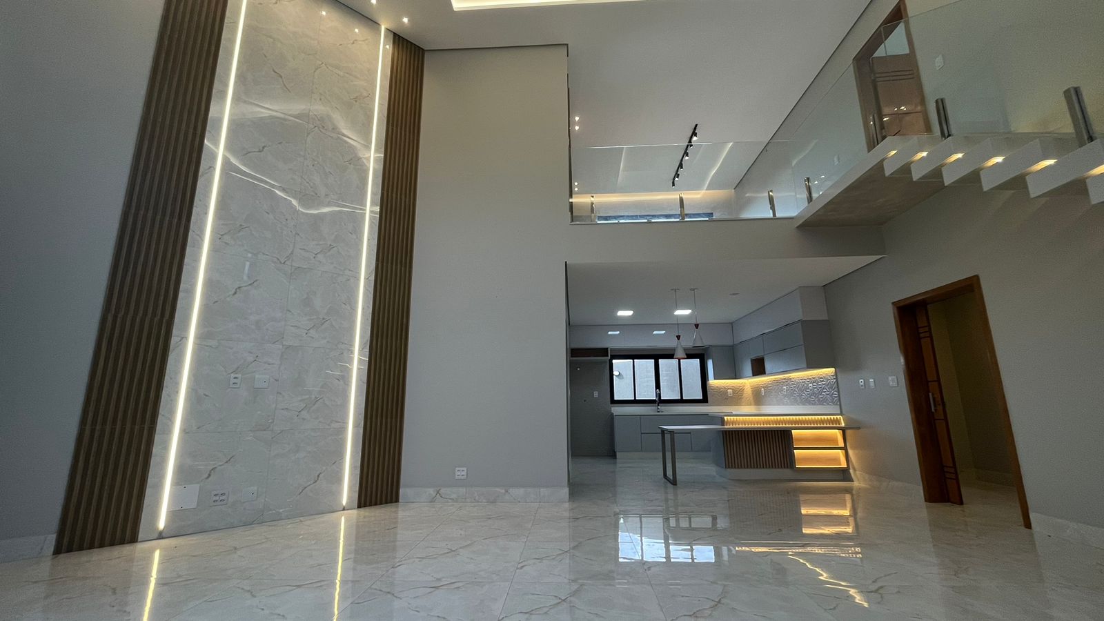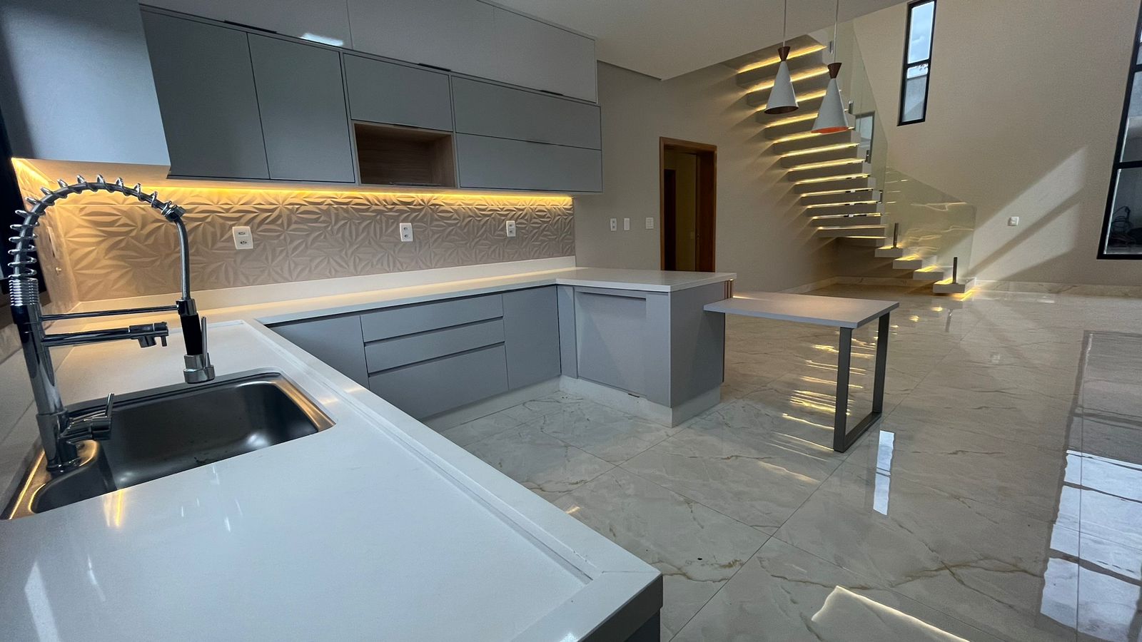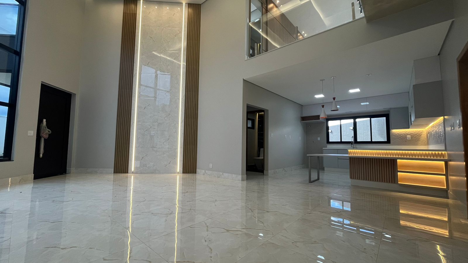 No térreo, três suítes oferecem conforto e privacidade para toda a família, enquanto a sala ampla com pé-direito duplo de 6 metros proporciona um ambiente arejado e convidativo. A cozinha integrada, repleta de armários planejados, torna o preparo das refeições uma experiência prazerosa, enquanto a lavanderia e a área verde oferecem praticidade e serenidade.